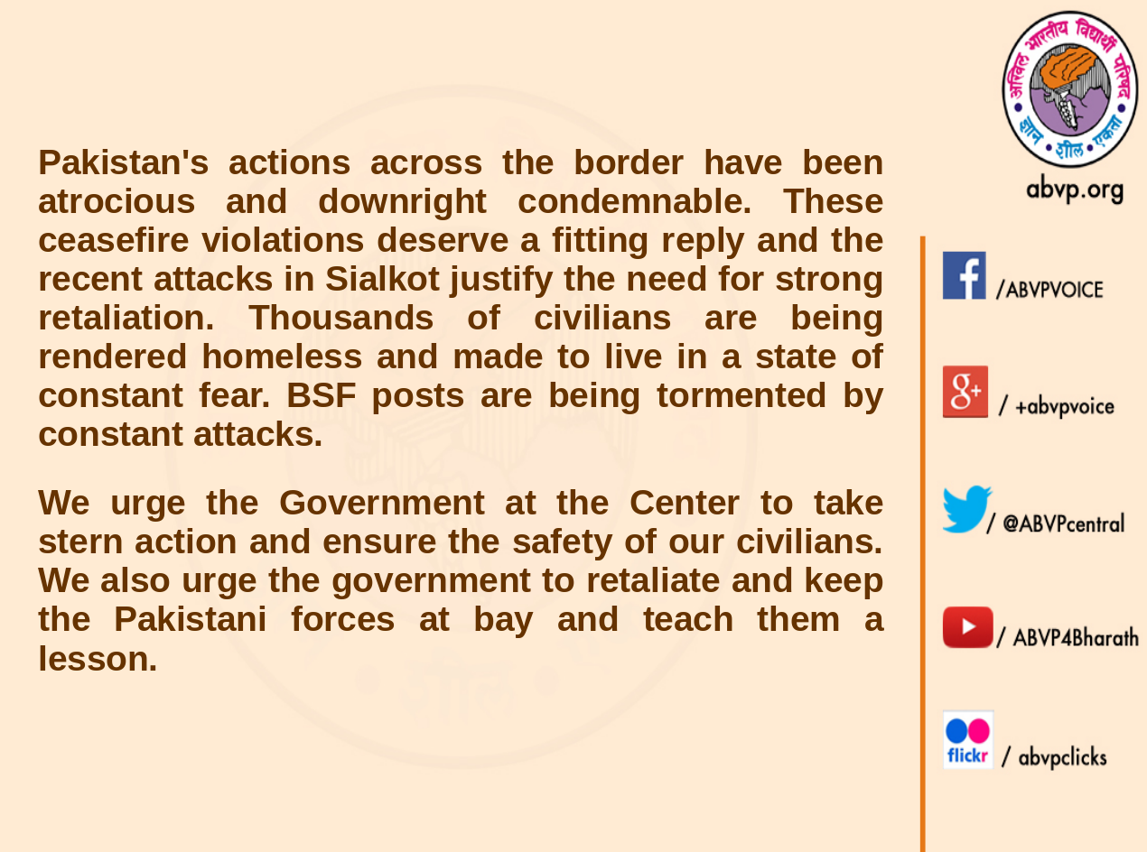Pakistan's actions across the border have been atrocious and downright condemnable. These ceasefire violations deserve a fitting reply and the recent attacks in Sialkot justify the need for strong retaliation. Thousands of civilians are being rendered homeless and made to live in a state of constant fear. BSF posts are being tormented by constant attacks.